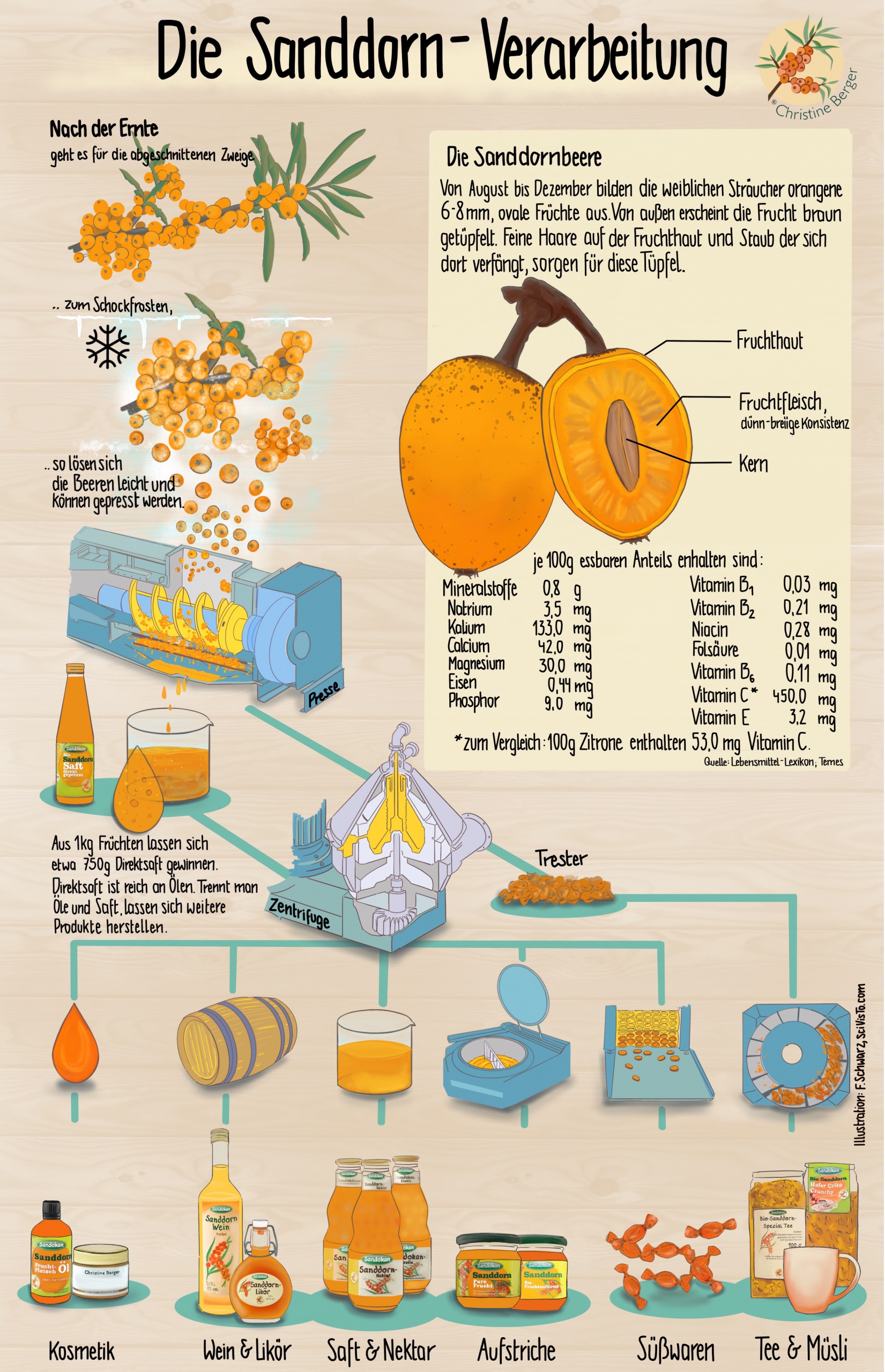 Der Sanddorn, den wir für unsere Produkte verwenden, stammt ausschließlich aus eigenem Bio-Anbau in der Gegend von Werder (Havel) bei Potsdam. Auf dem Schaubild haben wir veranschaulicht, wie die Beeren geerntet und verarbeitet werden.